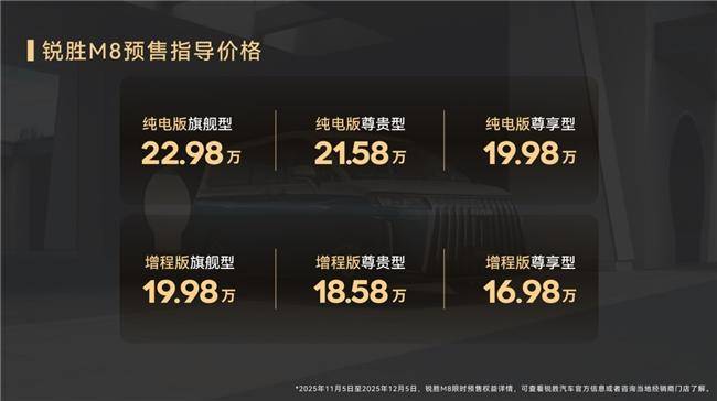 购车时,购车成本无疑会是我们购买与否的关键因素。锐胜M8此次预售会公布的版本价格:增程版的预售价是16.98万起;EV版的预售价是19.98万起。整体购车成本在同级别中具备较强的诱惑力且契合大多数用户购买MPV时的预算。